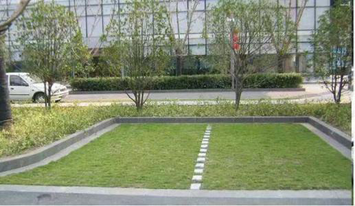 6. 在植草格種植土層上鋪草皮或播草子。鋪草皮時(shí)需將草皮壓實(shí)于種植土上。澆水養(yǎng)護(hù)待草成活后即可停車。