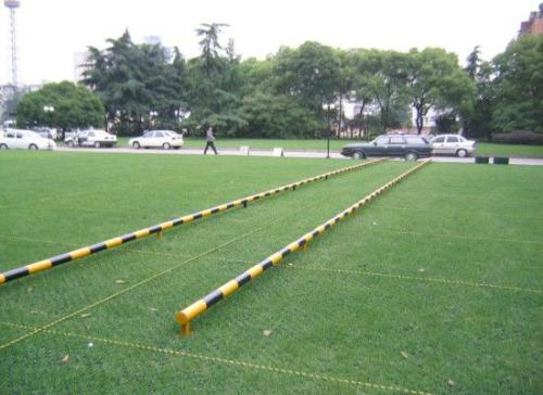 4. 在基層上撒少許有機(jī)肥,人工鋪裝植草格。植草格的外形尺寸是根據(jù)停車位的尺寸模數(shù)設(shè)計(jì)的,一般在鋪裝時(shí)不用裁剪;當(dāng)停車位有特殊形狀要求或停車位上有污水井蓋時(shí),植草格可作裁剪以適合停車位不同形狀的要求。