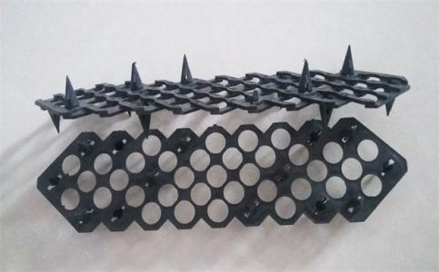 連接扣是由HDPE(高密度聚乙烯)材料在特定的設(shè)備下壓制而成,連接扣上下表面具備倒鉤特性的棘爪能將生態(tài)袋緊密相連,棘爪的總數(shù)應(yīng)不少于12個(gè),高度不小于25mm,倒鉤棘爪與生態(tài)袋能始終保持垂直緊貼,連接扣的雙向通道凹槽和垂直孔洞合成相互交錯(cuò)的非流線型凸肋,其作用加大了連接扣表面與生態(tài)袋之間的摩擦力,充分發(fā)揮其柔性結(jié)構(gòu)的受力特點(diǎn)。
